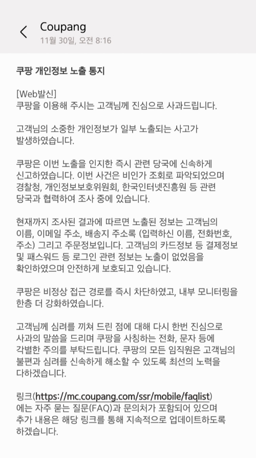 쿠팡을 더 이상 사용하지 않거나, 보안이 불안하다면 계정 탈퇴도 고려할 수 있습니다.